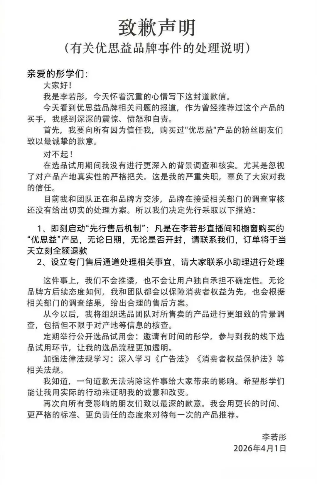 4月1日,演员李若彤发布致歉声明,表示作为曾经推荐过这个产品的买手,“感到深深的震惊、愤怒和自责”。