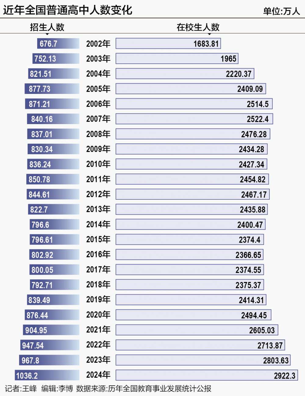 国家统计局数据显示,2024年,全国普通高中招生1036.2万人,首次突破1000万人,比上年增加68.4万人,是上年增幅的三倍多,且增幅为20年来之最;在校生2922.3万人,比上年增加118.7万人,按照这个增速股指配资开户,到2025年末高中在校生有望突破3000万人。