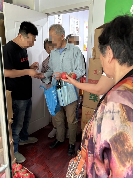 老人们听完保健品推荐后,依次出门领取鸡蛋、蔬菜。杨书源 摄