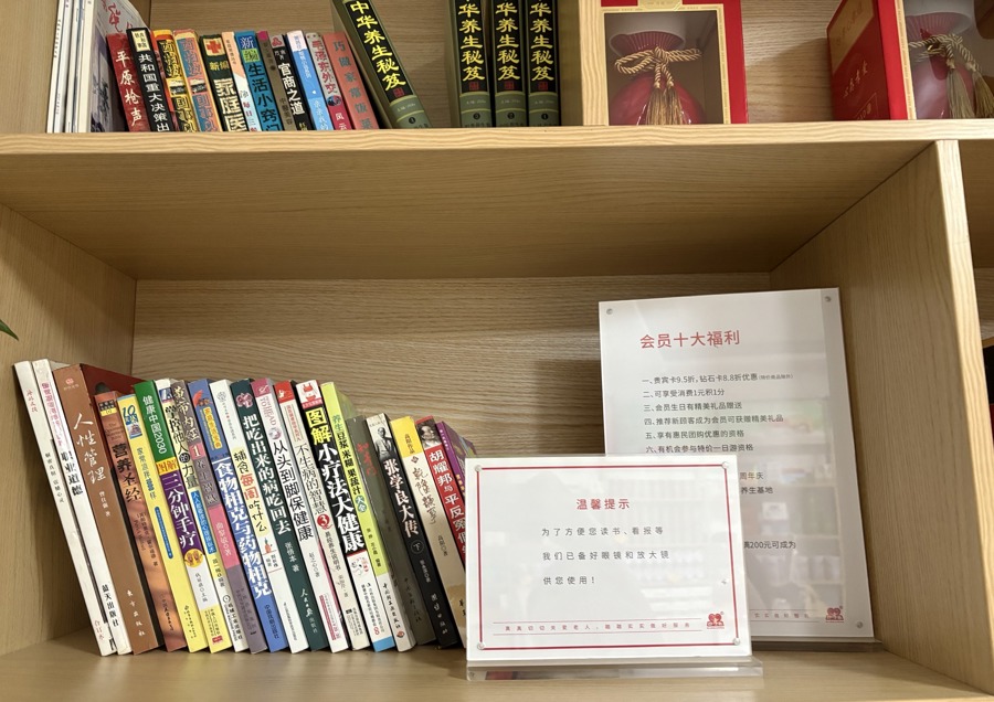 店内划了几个分区:体验区摆着熏蒸桶、护眼仪、艾灸椅;活动区上午讲课,下午给老人唱歌跳舞。一间阅览室备着老花镜,书桌掀开盖板就是麻将桌,连麻将都是加大号的。