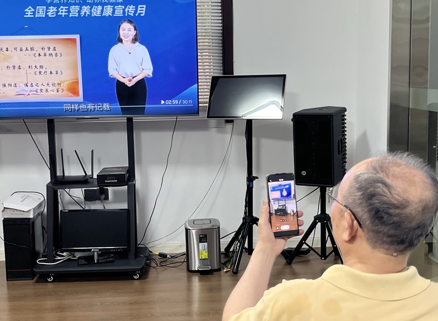 叶亚军在给店里的老年人播放健康讲座视频。 杨书源 摄