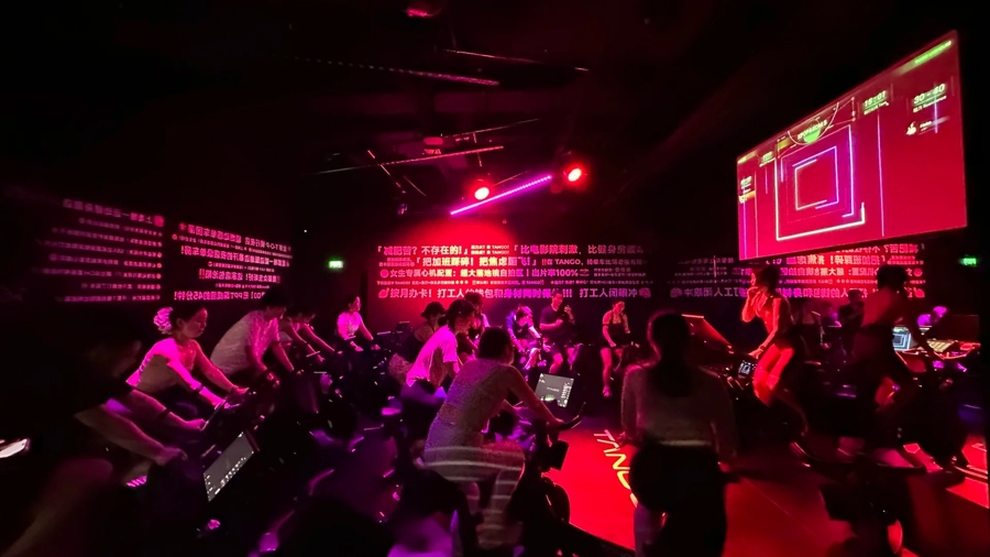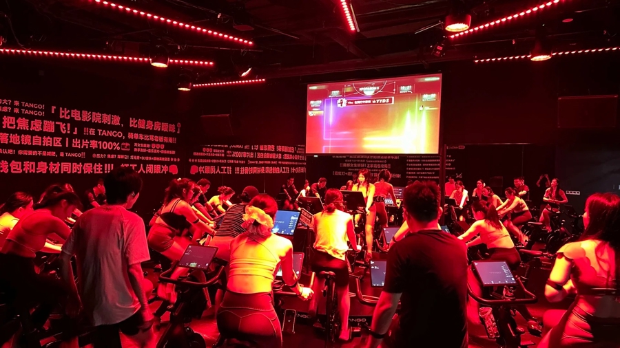 这是晚上8点的TANGO 音乐飞轮。不同于传统健身房的跑步撸铁,抛却枯燥单调的机械运动,淮海路上的白领们脱下套装,换上轻薄的运动服,在幻彩灯光和动感音乐中,走进这座“音乐飞轮”。他们所期待的不仅是运动减脂、塑形修身,更是在派对氛围中释放压力,在快乐蹦迪中结交朋友。