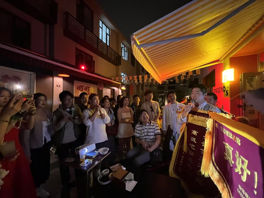 “当新华路梧桐树影再次被夏风拉长,无碍理想的屋檐下,迎来了第365次举杯相庆的时光。”上个月,“无碍理想”迎来一周年,新朋旧友相聚在仅有30平方米的小酒馆内外,唱歌跳舞、合影留念、交换礼物……嗨到深夜。